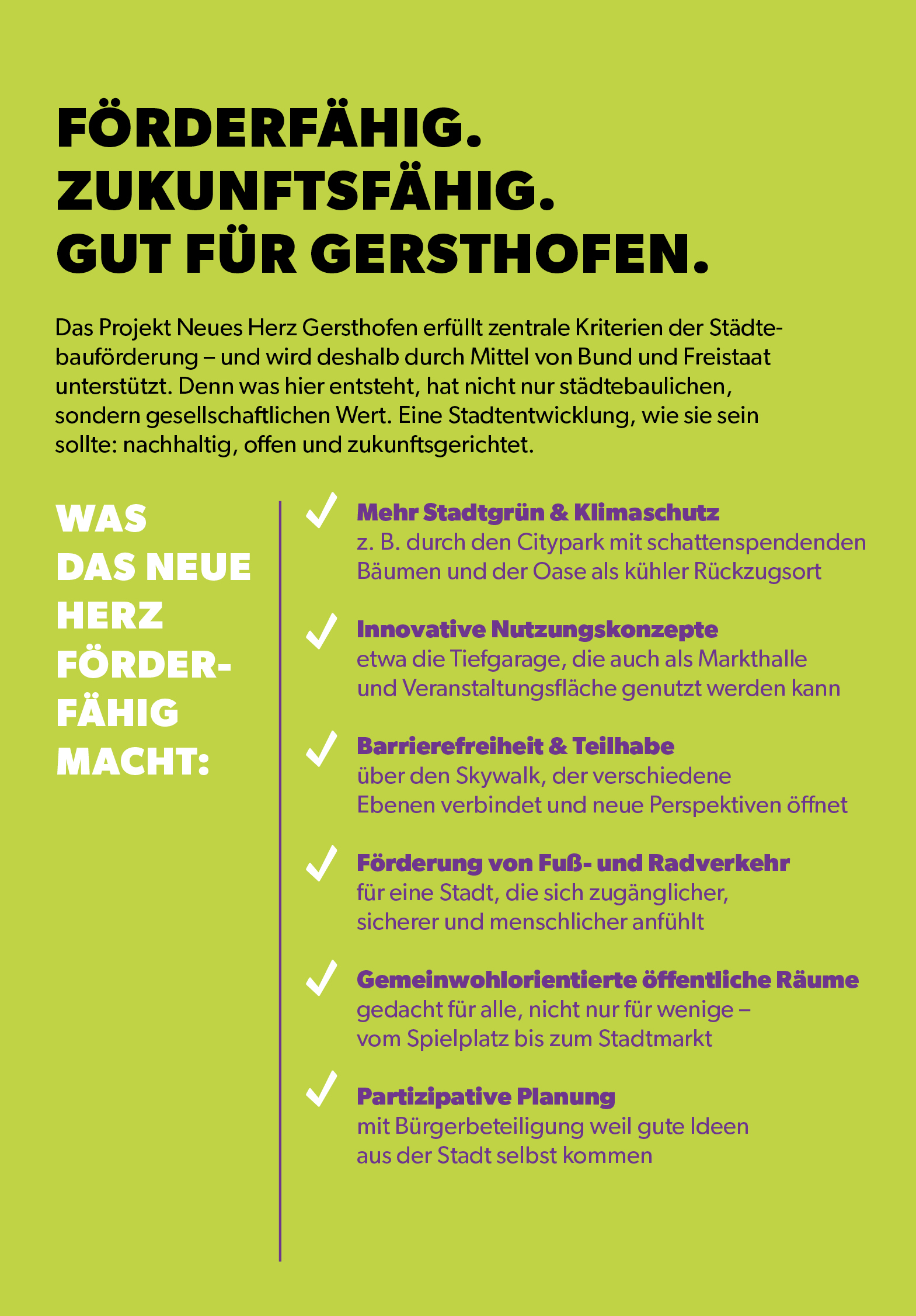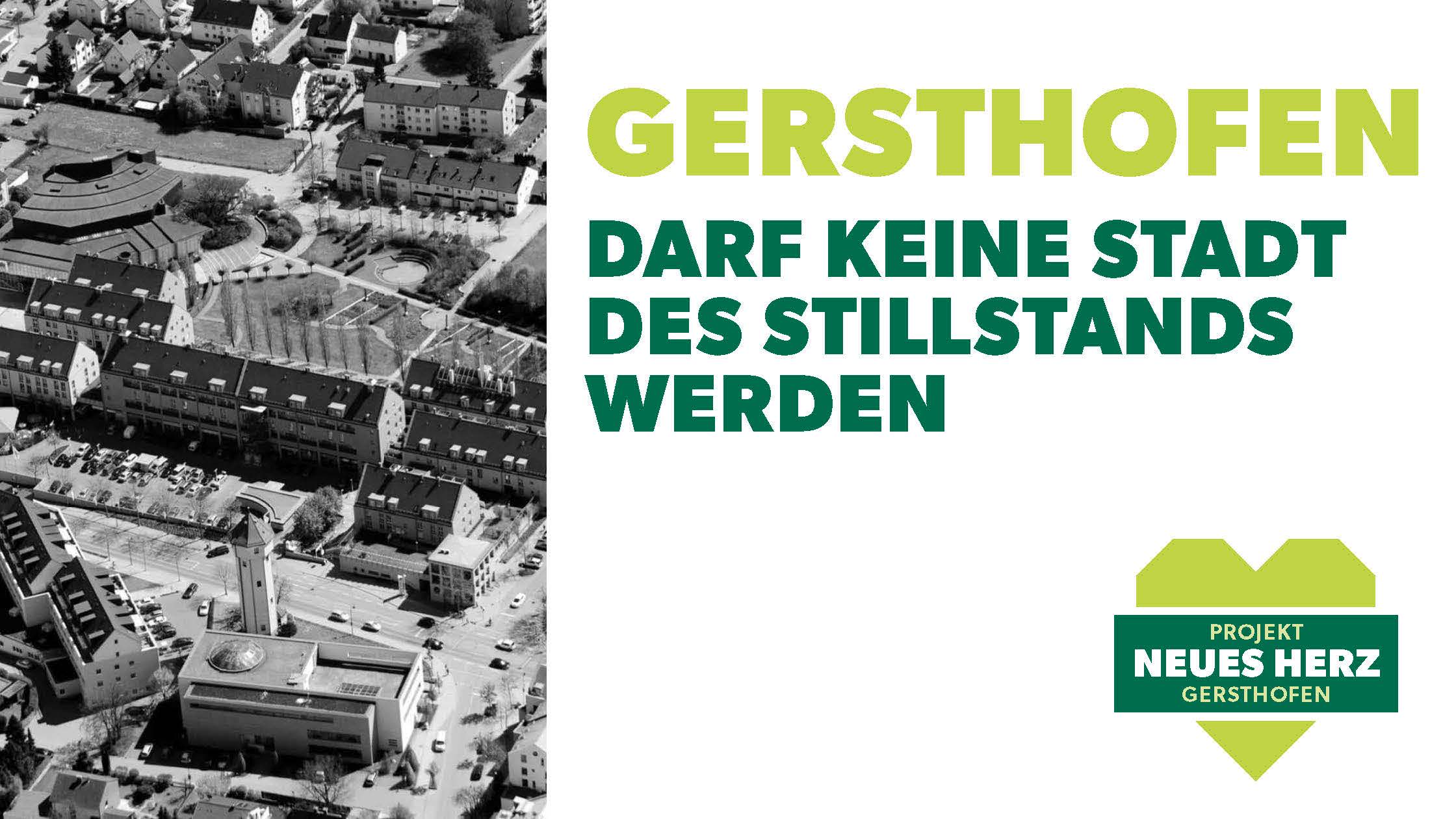 Gersthofen darf keine Stadt des Stillstandes werden. Viele Innenstädte in Deutschland kämpfen mit Leerstand und sinkender Frequenz. Mit dem „Neuen Herz“ gestalten wir aktiv diecZukunft unserer Stadtmitte und sorgen für mehr Lebendigkeit und Aufenthaltsqualität.