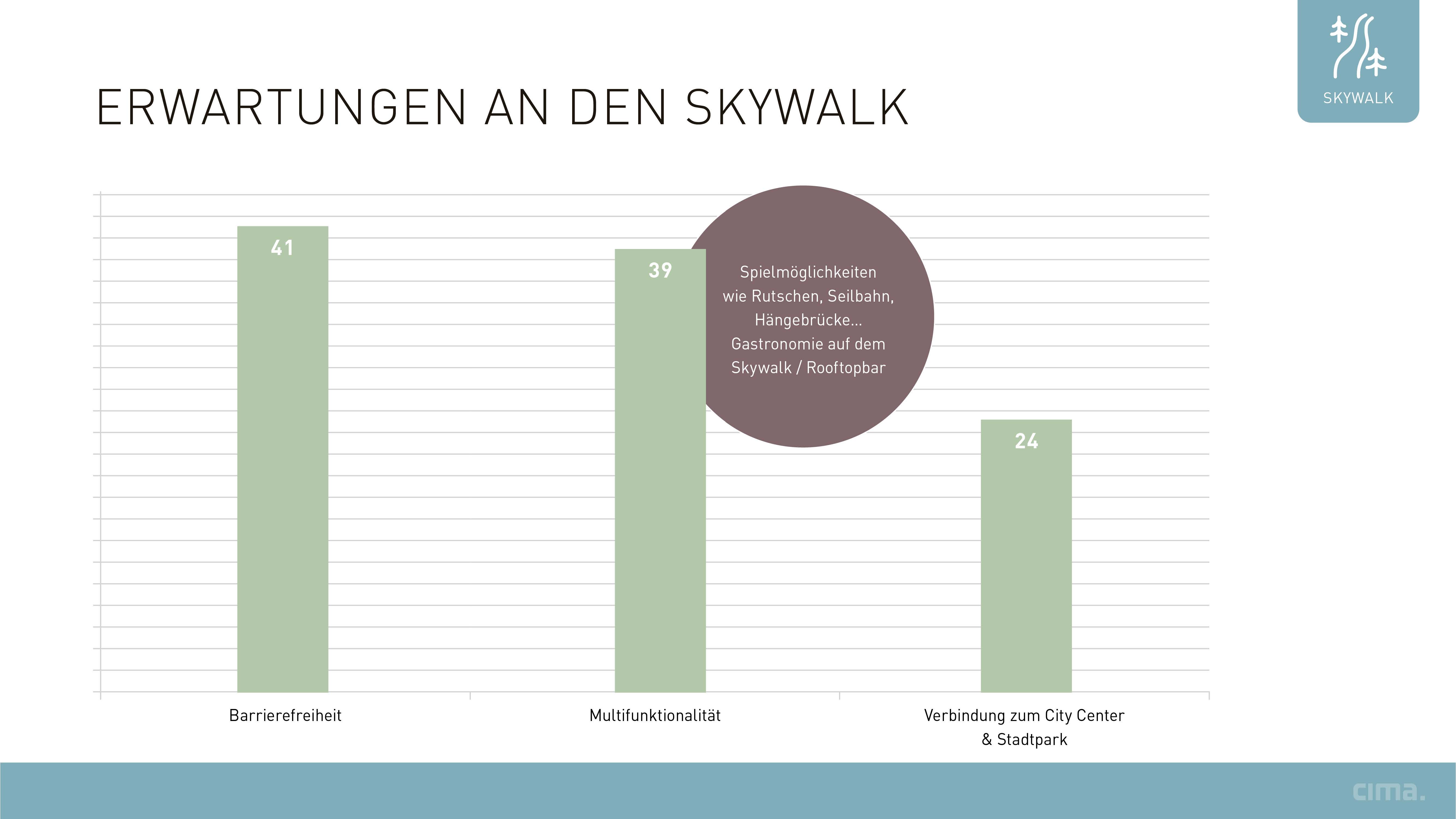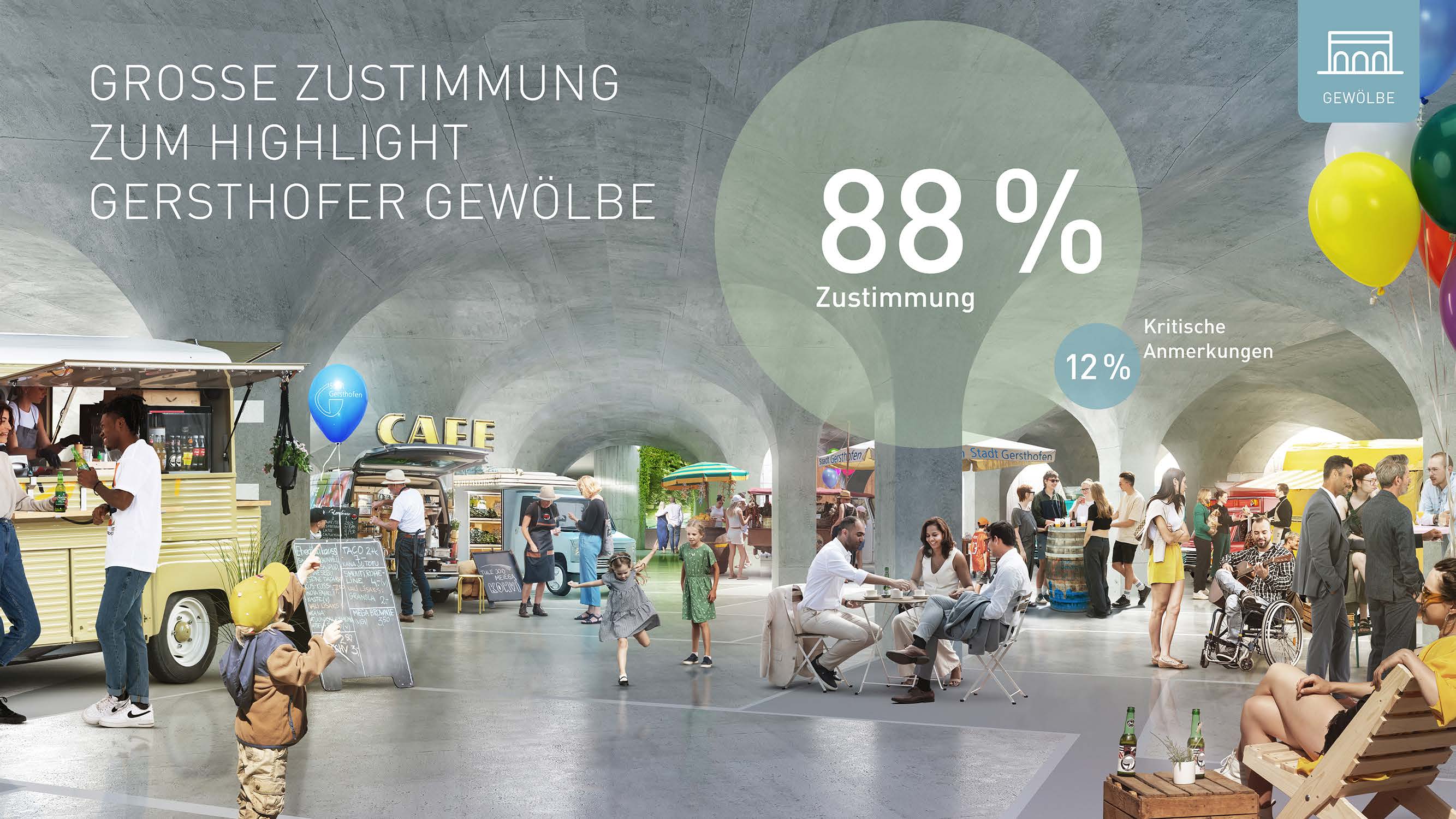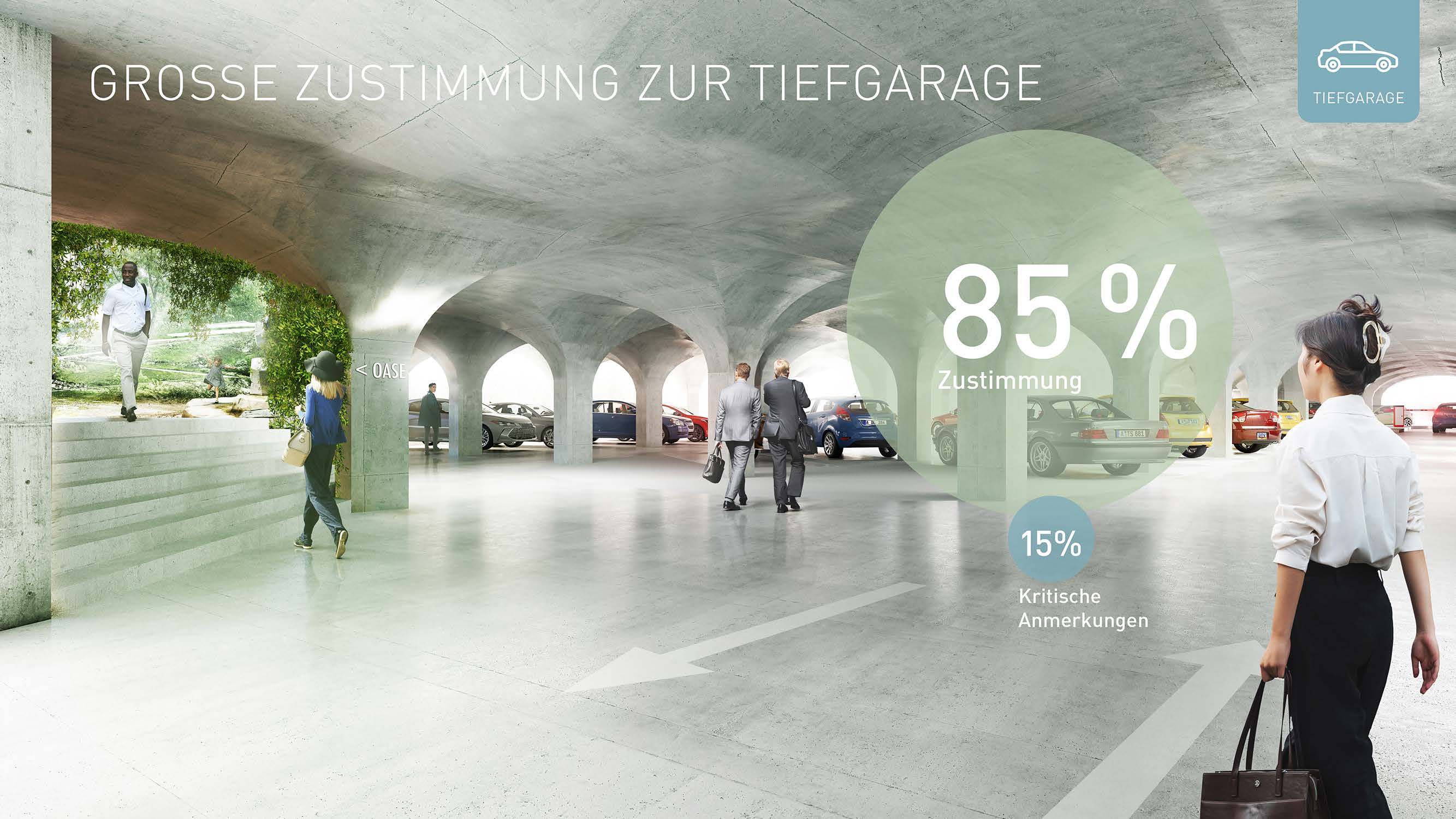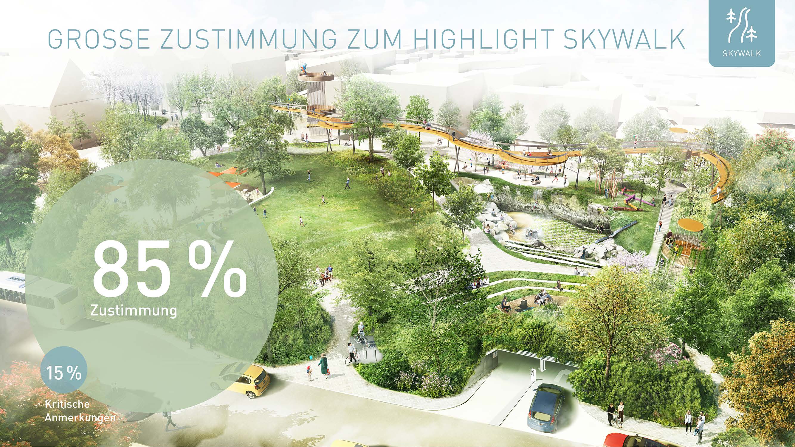 Die Zustimmungswerte im Einzelnen: Skywalk (85%), Wandelbare Tiefgarage zum Eventraum (88%), Tiefgarage (85%), Oase (100%)