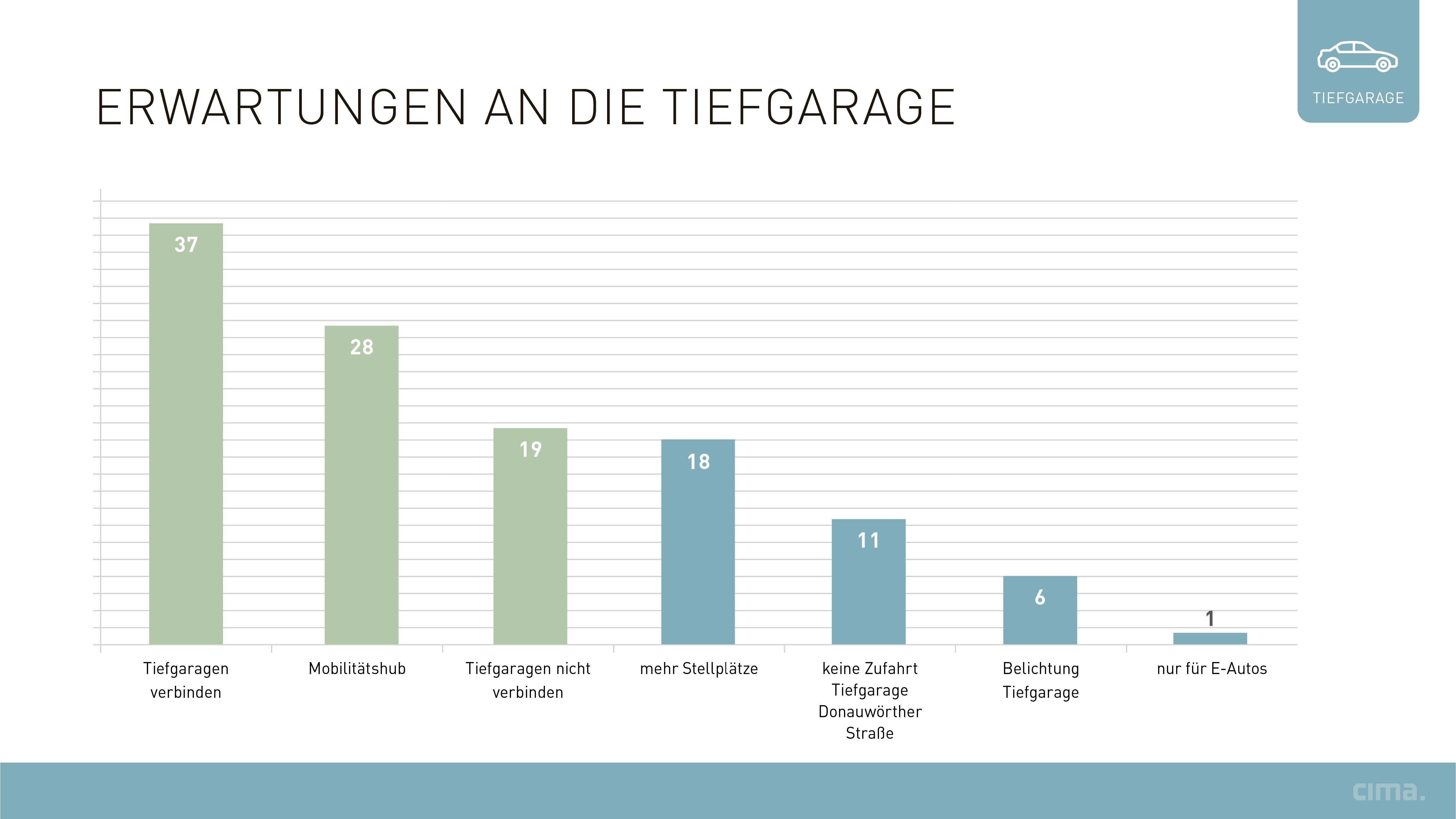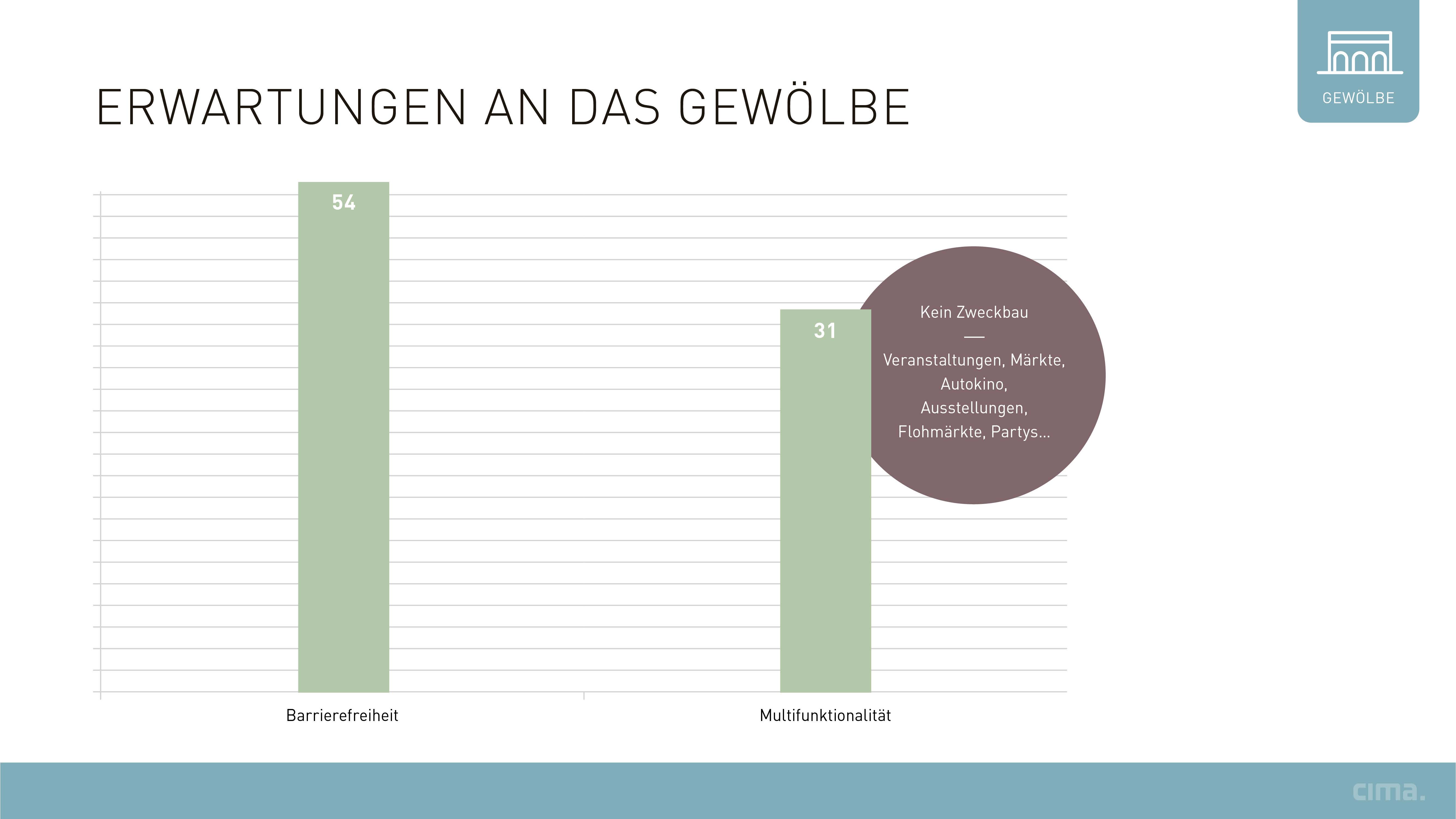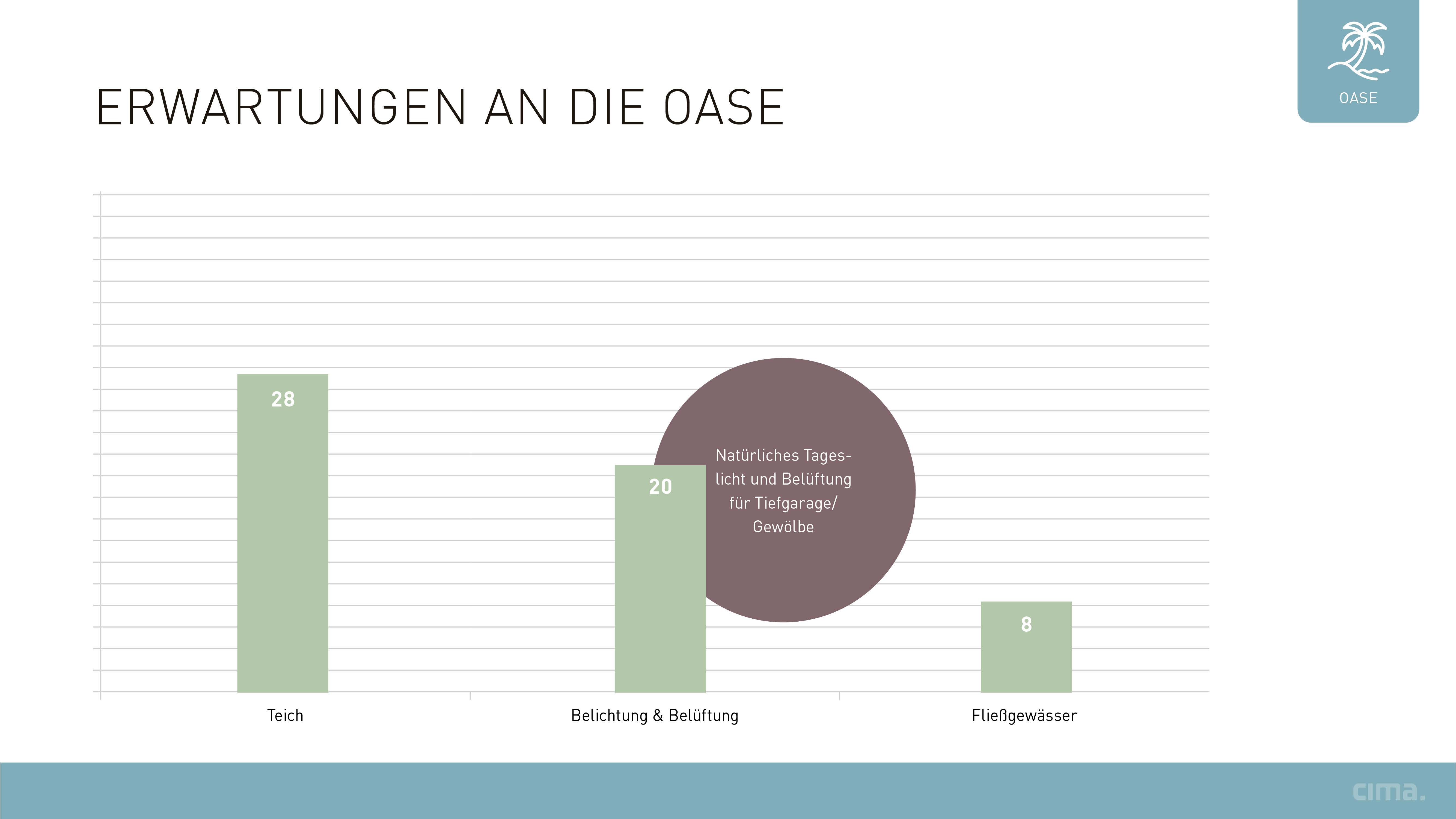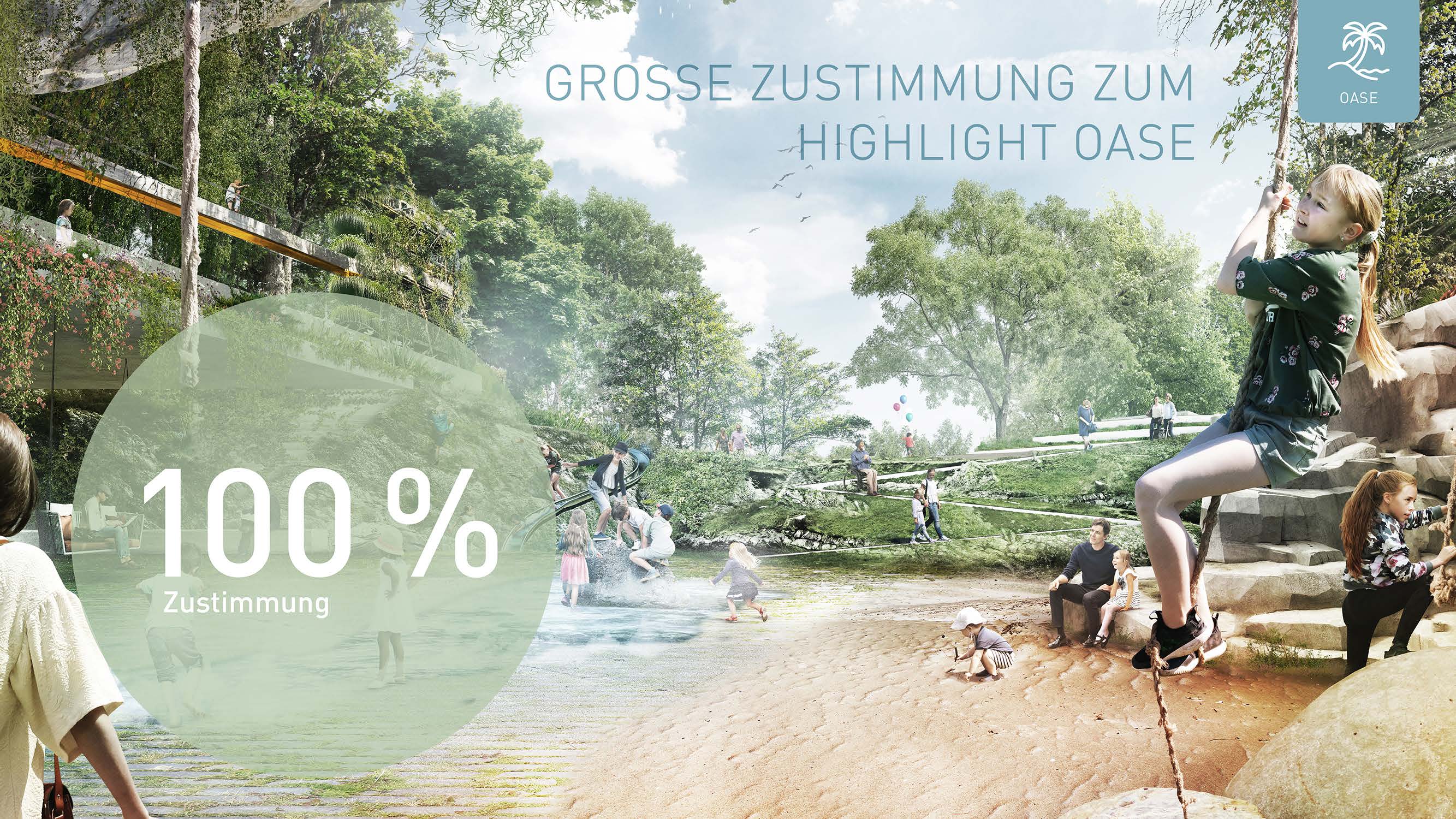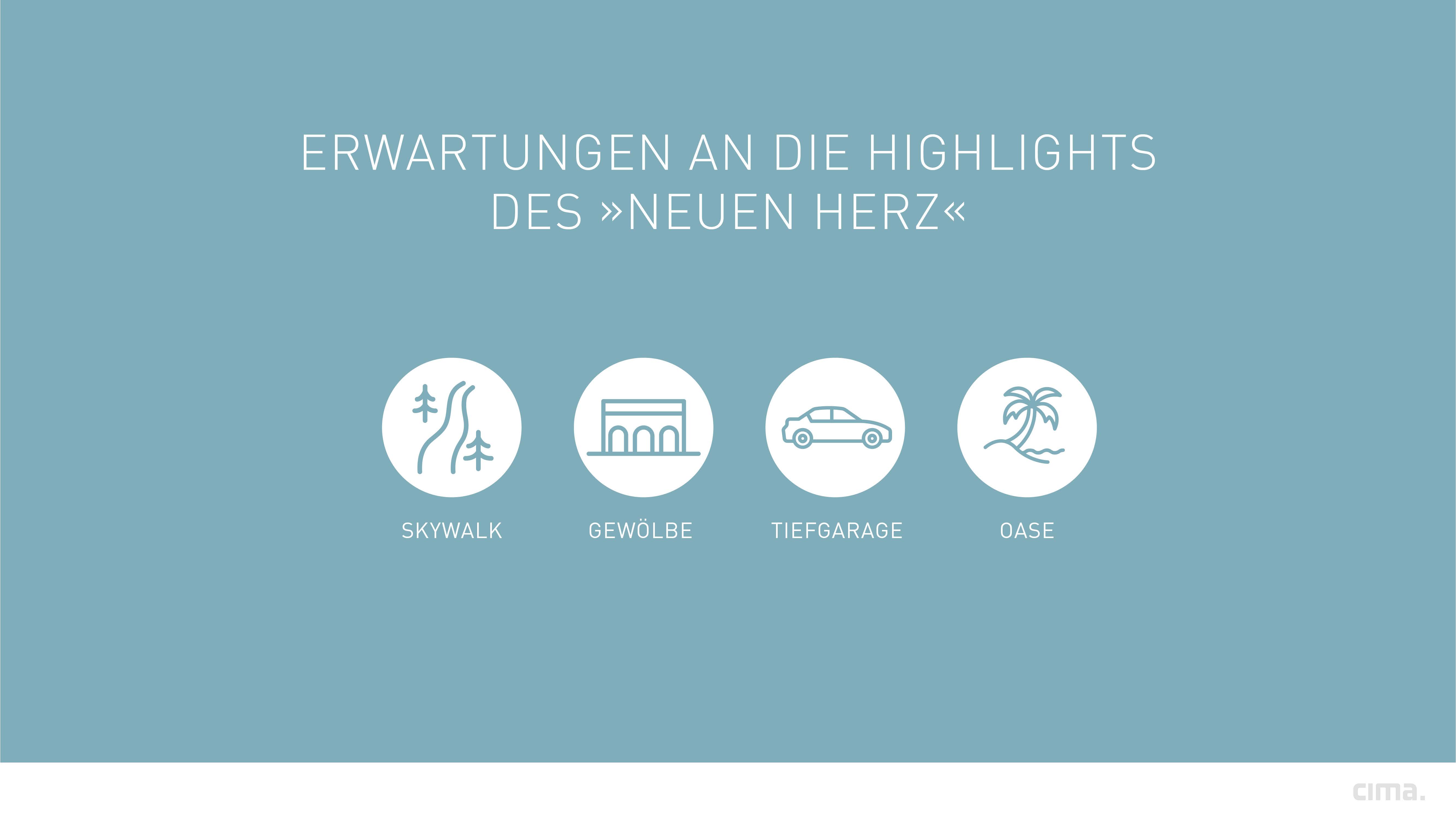 Die Zustimmungswerte im Einzelnen: Skywalk (85%), Wandelbare Tiefgarage zum Eventraum (88%), Tiefgarage (85%), Oase (100%)