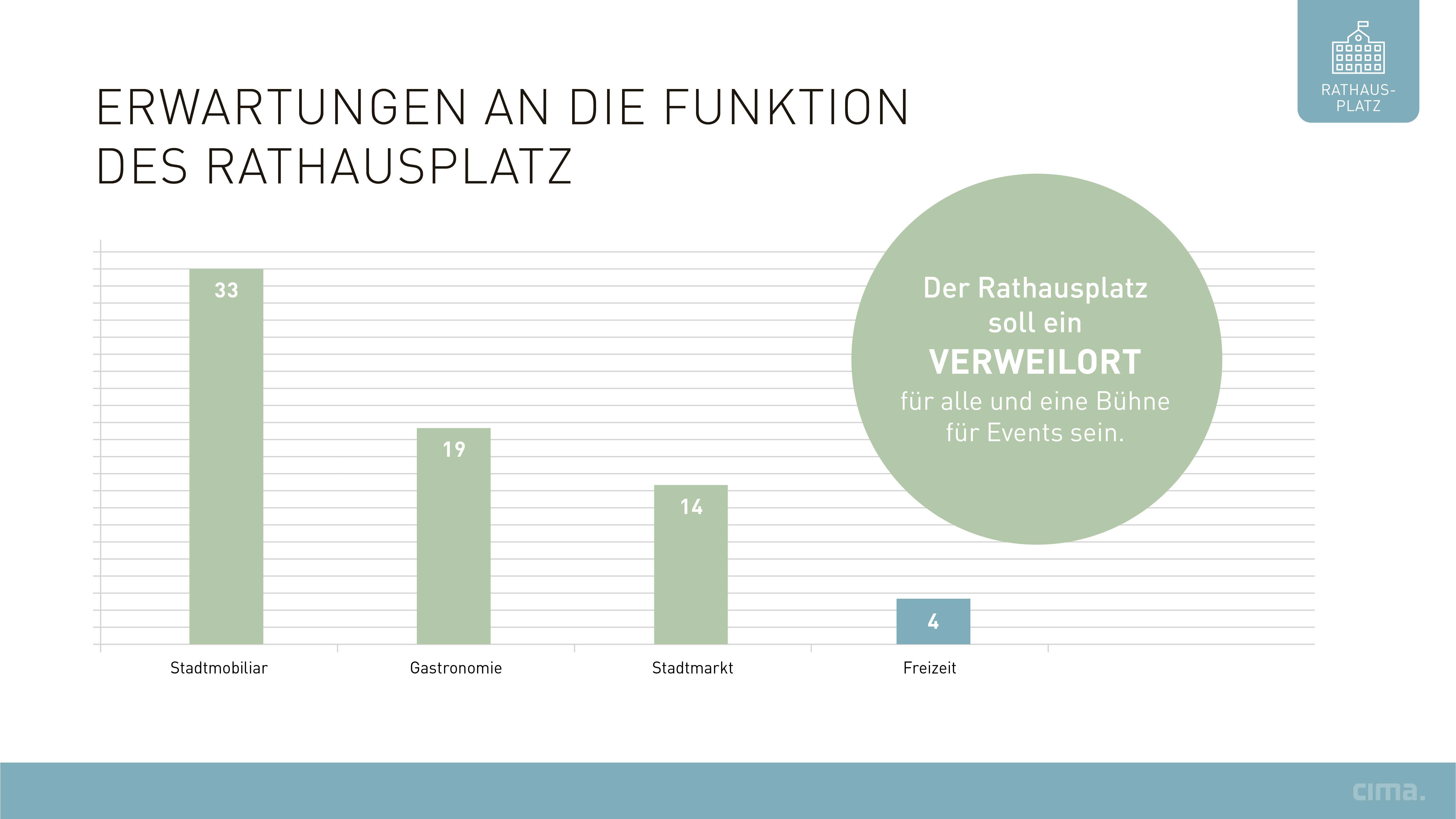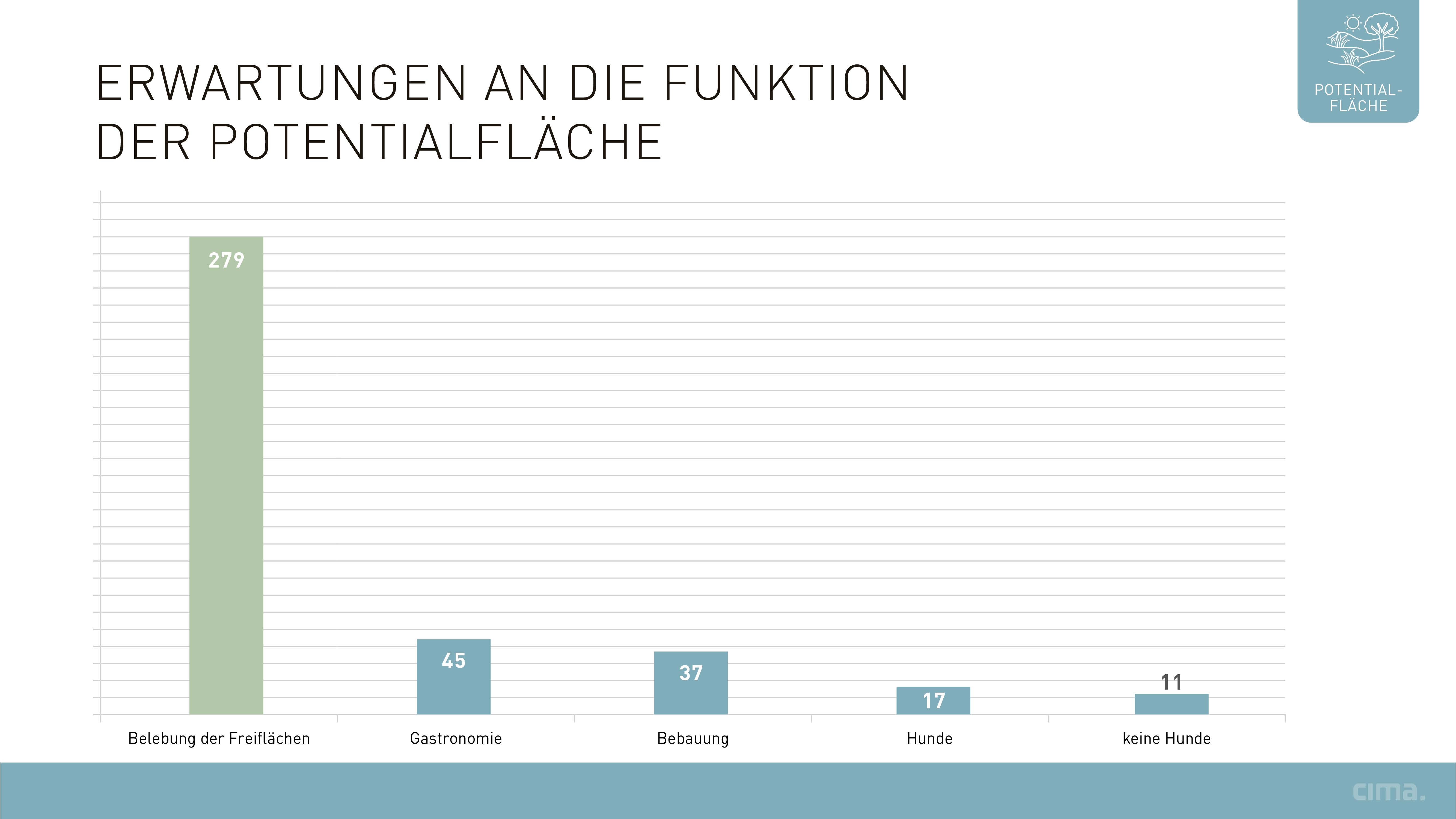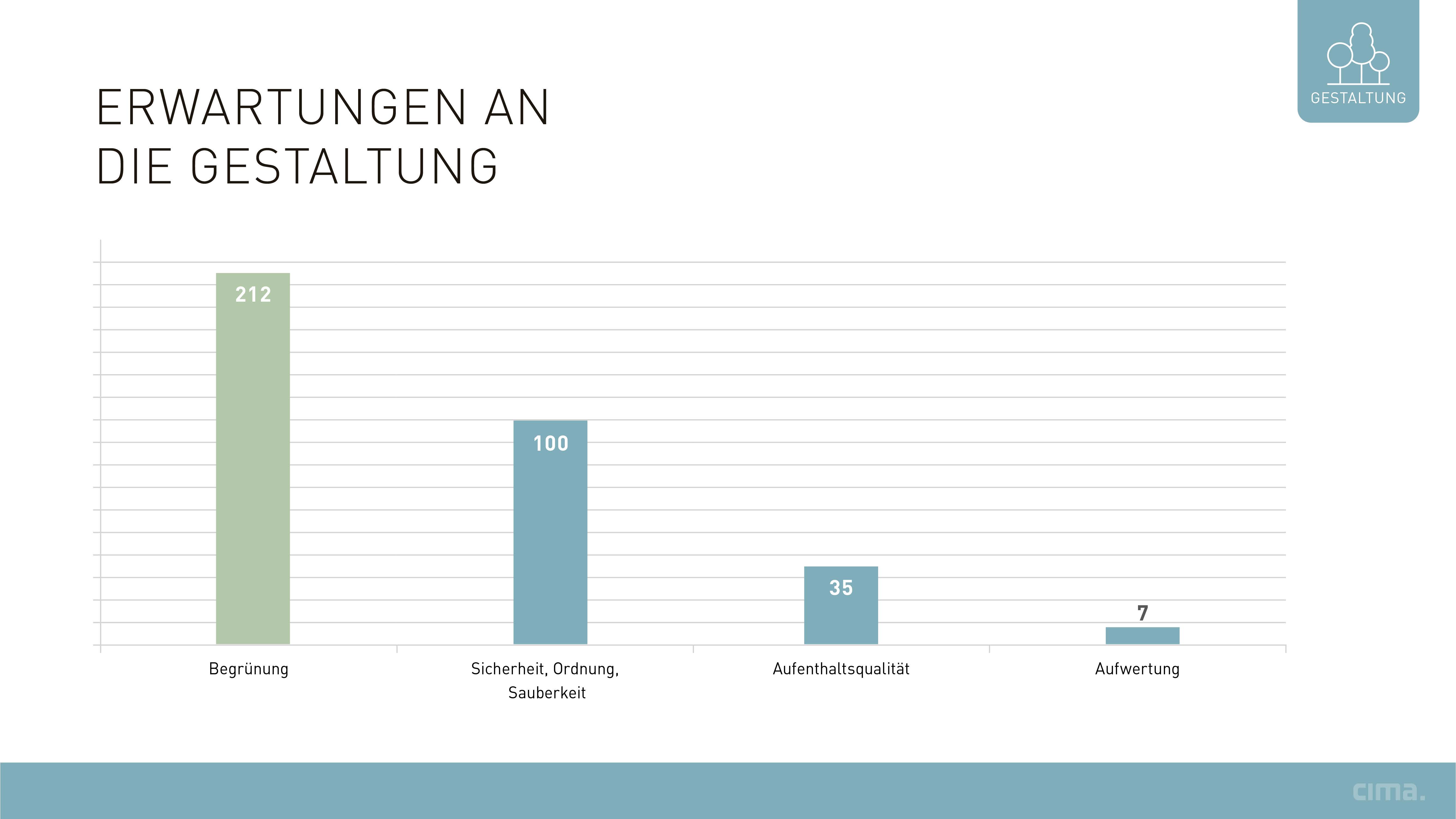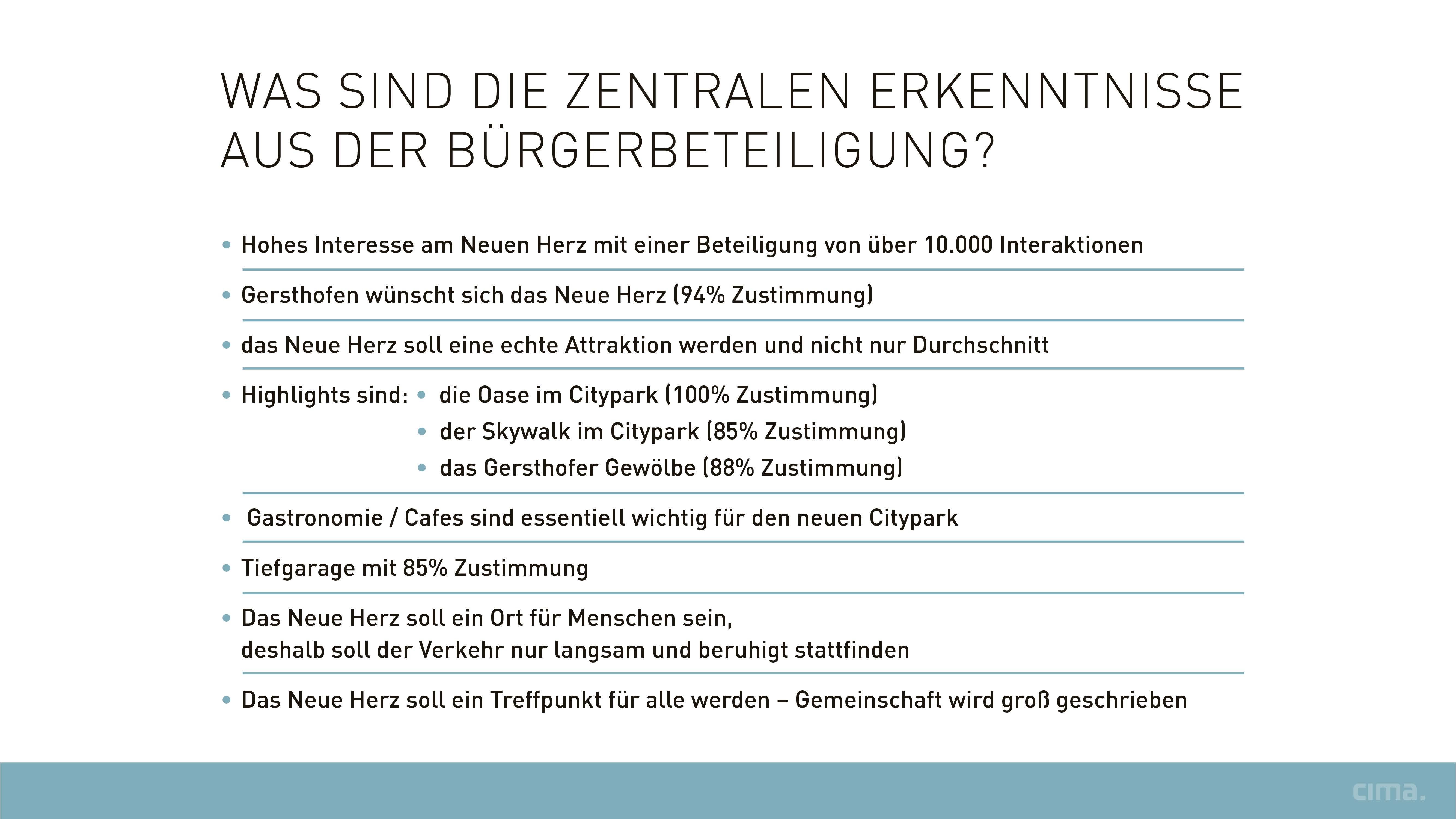 Die Zustimmungswerte im Einzelnen: Skywalk (85%), Wandelbare Tiefgarage zum Eventraum (88%), Tiefgarage (85%), Oase (100%)