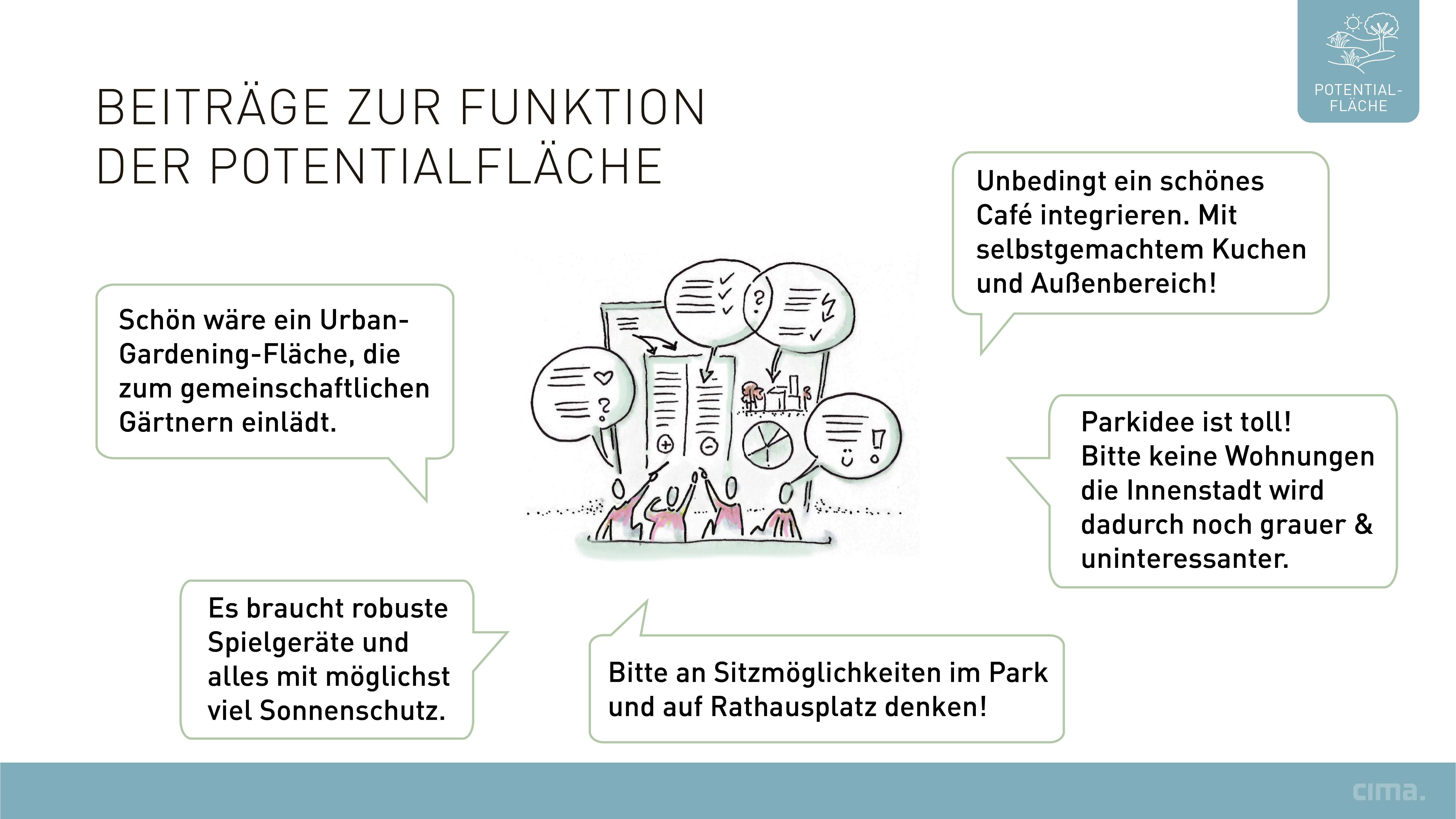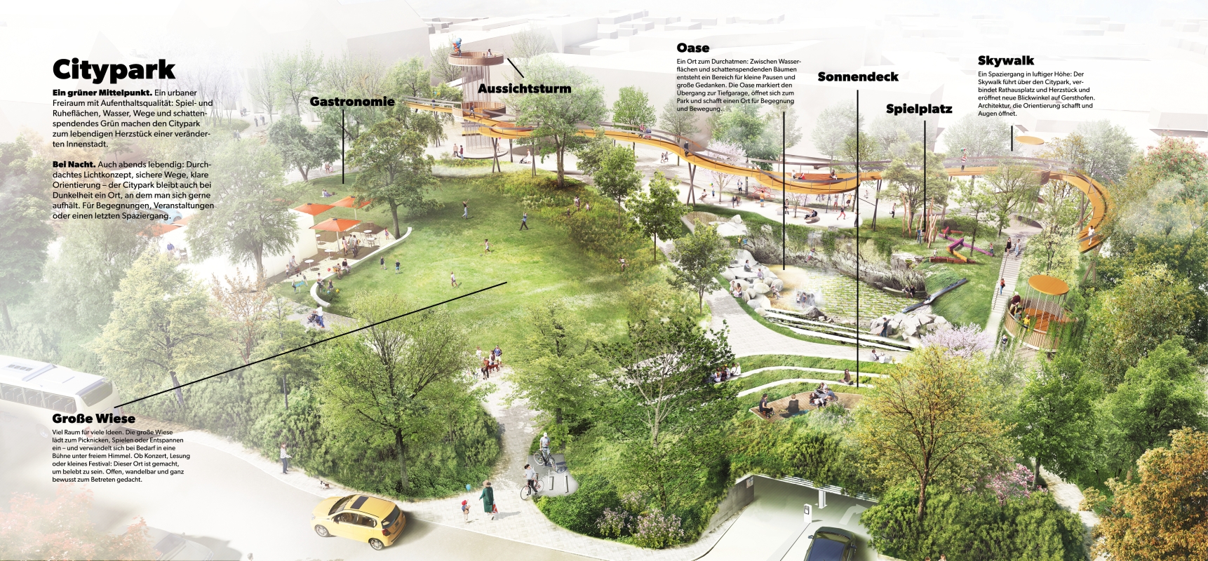 Zusätzlich zum bestehenden Stadtpark entsteht auf der Potenzialfläche ein lebendiger Citypark mit Wasserspiel, Spiel-, Aufenthalts- und Veranstaltungsflächen. Gemeinsam stärken beide Grünräume die Lebensqualität im Zentrum.