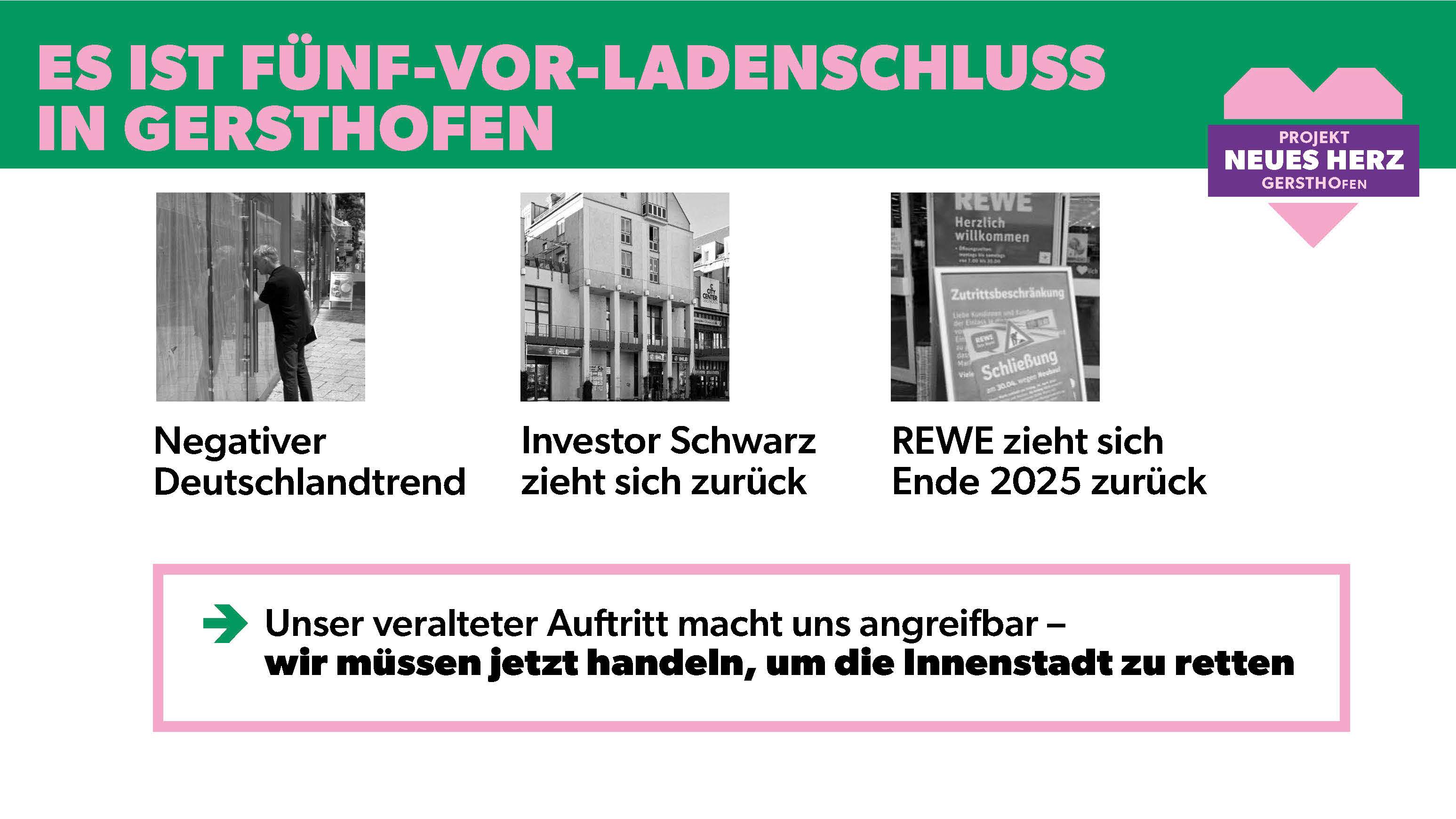 Der Rückzug großer Einzelhändler, gescheiterte Investitionen, eine sinkende Besucherfrequenz und zunehmender Leerstand haben uns deutlich vor Augen geführt, dass es so nicht weitergehen kann. Diese Dynamik ist nicht nur bedauerlich, sie bedroht die Lebendigkeit, Anziehungskraft und das Selbstverständnis unserer Stadt. Gersthofen darf keine Stadt des Stillstandes werden.